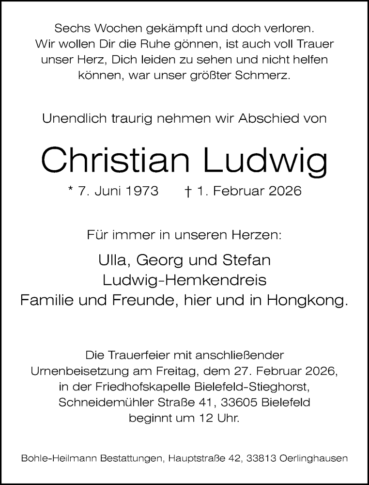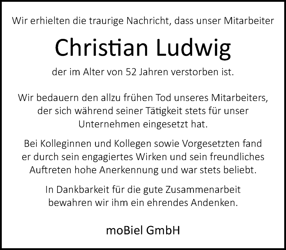 Hier finden Sie alle Traueranzeigen aus der Zeitung, die bisher für Christian Ludwig erschienen sind. Weitere Traueranzeigen, die in der Zeitung erscheinen, werden hier ebenfalls aufgelistet
