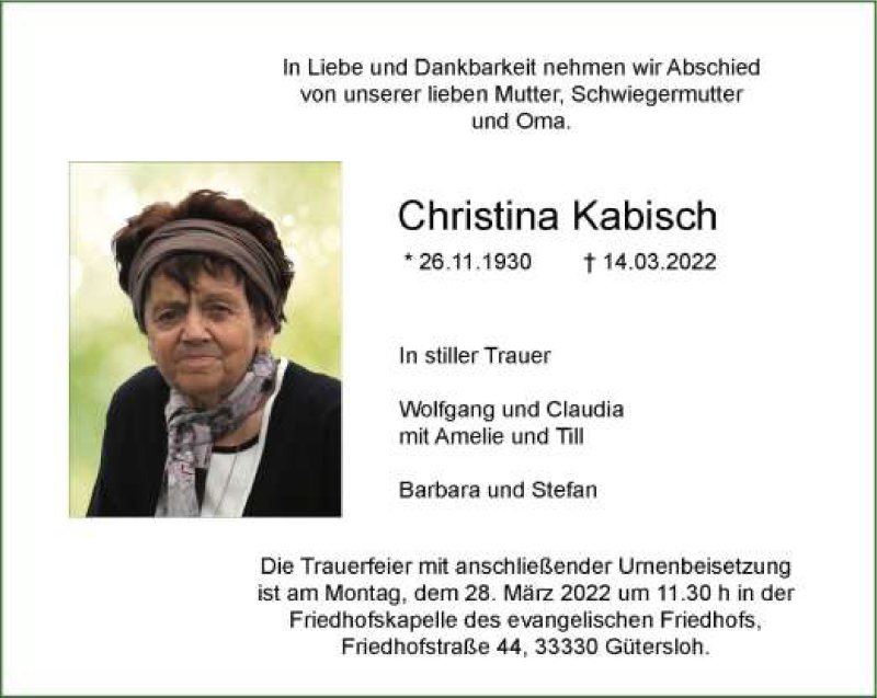 Hier finden Sie alle Traueranzeigen aus der Zeitung, die bisher für Christina Kabisch erschienen sind. Weitere Traueranzeigen, die in der Zeitung erscheinen, werden hier ebenfalls aufgelistet