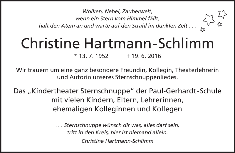 Hier finden Sie alle Traueranzeigen aus der Zeitung, die bisher für Christine Hartmann-Schlimm erschienen sind. Weitere Traueranzeigen, die in der Zeitung erscheinen, werden hier ebenfalls aufgelistet