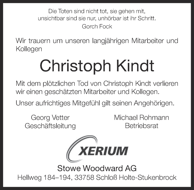 Hier finden Sie alle Traueranzeigen aus der Zeitung, die bisher für Christoph Kindt erschienen sind. Weitere Traueranzeigen, die in der Zeitung erscheinen, werden hier ebenfalls aufgelistet