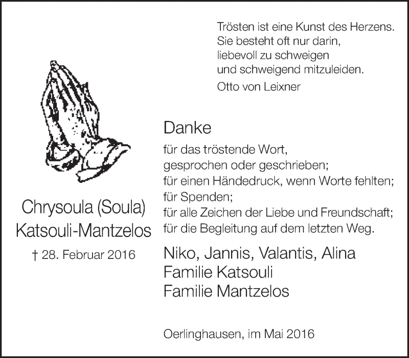 Hier finden Sie alle Traueranzeigen aus der Zeitung, die bisher für Chrysoula Katsouli-Mantzelos erschienen sind. Weitere Traueranzeigen, die in der Zeitung erscheinen, werden hier ebenfalls aufgelistet