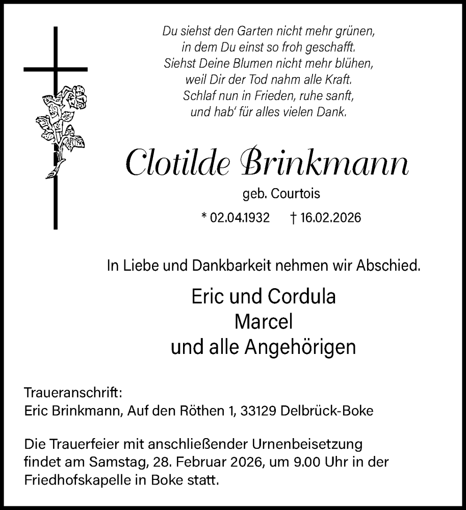 Hier finden Sie alle Traueranzeigen aus der Zeitung, die bisher für Clotilde Brinkmann erschienen sind. Weitere Traueranzeigen, die in der Zeitung erscheinen, werden hier ebenfalls aufgelistet