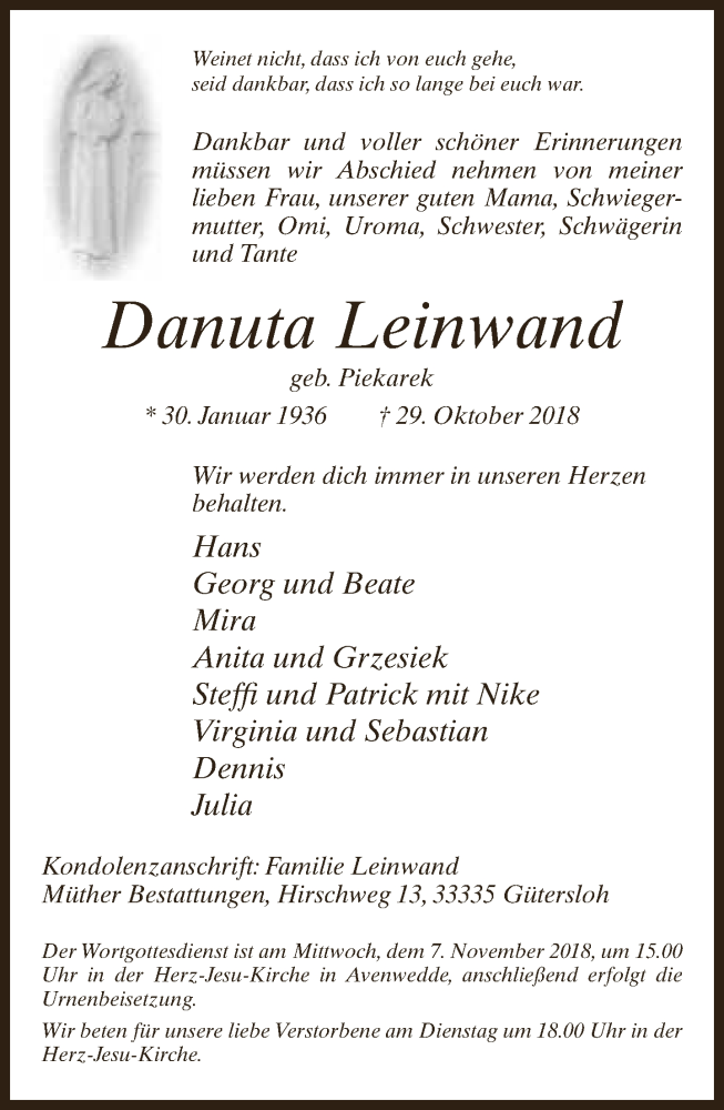 Hier finden Sie alle Traueranzeigen aus der Zeitung, die bisher für Danuta Leinwand erschienen sind. Weitere Traueranzeigen, die in der Zeitung erscheinen, werden hier ebenfalls aufgelistet