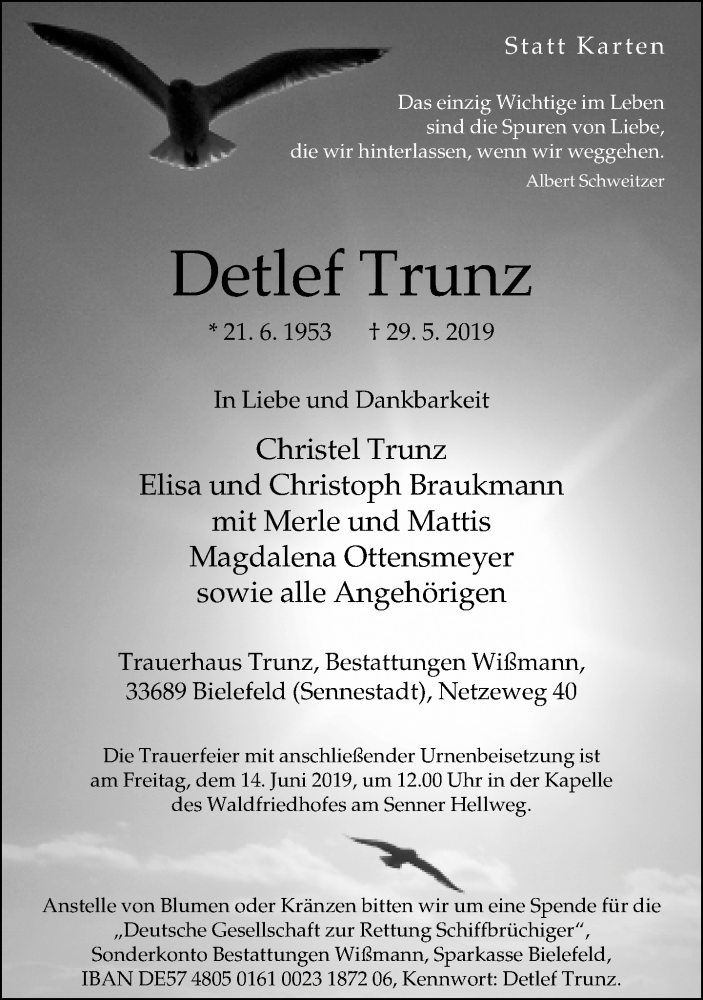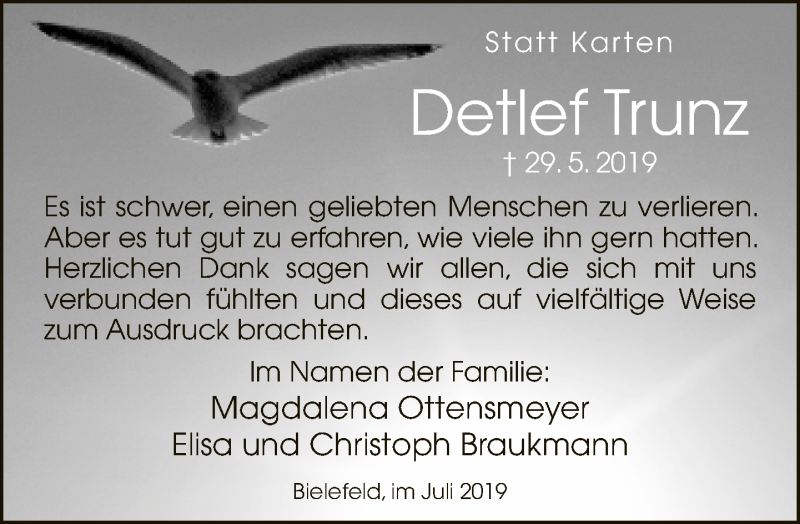Hier finden Sie alle Traueranzeigen aus der Zeitung, die bisher für Detlef Trunz erschienen sind. Weitere Traueranzeigen, die in der Zeitung erscheinen, werden hier ebenfalls aufgelistet
