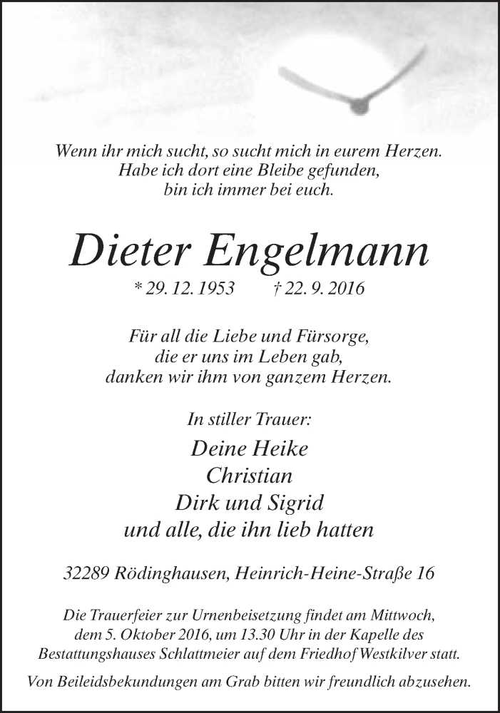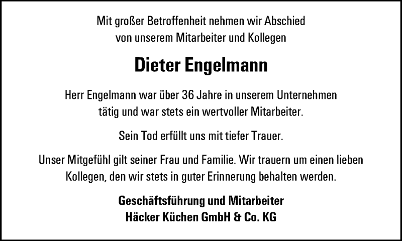 Hier finden Sie alle Traueranzeigen aus der Zeitung, die bisher für Dieter Engelmann erschienen sind. Weitere Traueranzeigen, die in der Zeitung erscheinen, werden hier ebenfalls aufgelistet