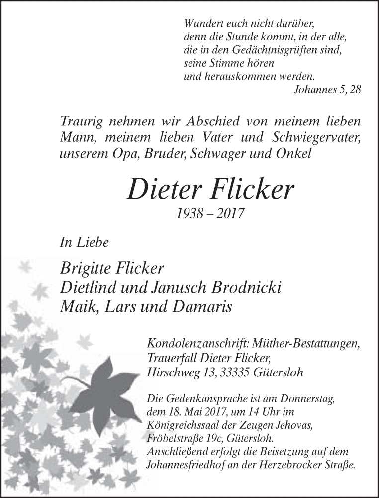 Hier finden Sie alle Traueranzeigen aus der Zeitung, die bisher für Dieter Flicker erschienen sind. Weitere Traueranzeigen, die in der Zeitung erscheinen, werden hier ebenfalls aufgelistet