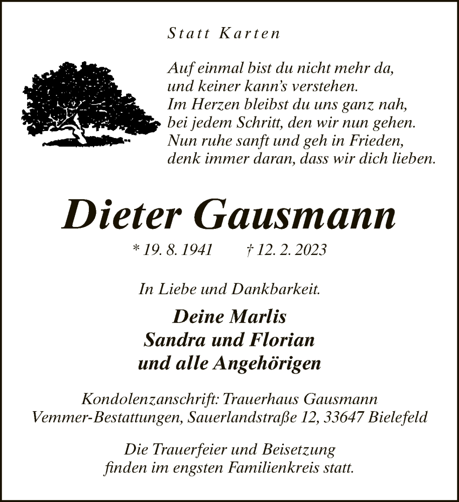 Hier finden Sie alle Traueranzeigen aus der Zeitung, die bisher für Dieter Gausmann erschienen sind. Weitere Traueranzeigen, die in der Zeitung erscheinen, werden hier ebenfalls aufgelistet
