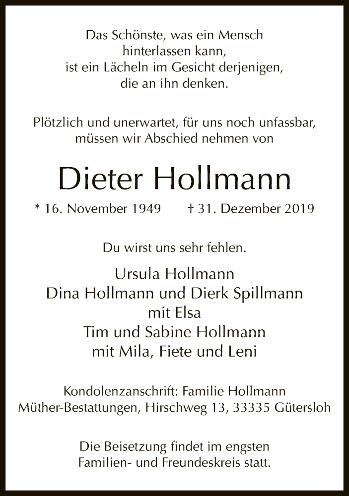Hier finden Sie alle Traueranzeigen aus der Zeitung, die bisher für Dieter Hollmann erschienen sind. Weitere Traueranzeigen, die in der Zeitung erscheinen, werden hier ebenfalls aufgelistet