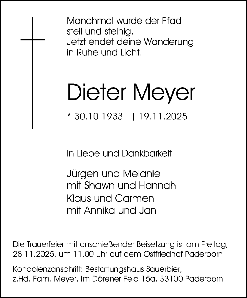 Hier finden Sie alle Traueranzeigen aus der Zeitung, die bisher für Dieter Meyer erschienen sind. Weitere Traueranzeigen, die in der Zeitung erscheinen, werden hier ebenfalls aufgelistet