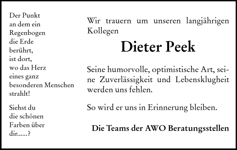 Hier finden Sie alle Traueranzeigen aus der Zeitung, die bisher für Dieter Peek erschienen sind. Weitere Traueranzeigen, die in der Zeitung erscheinen, werden hier ebenfalls aufgelistet