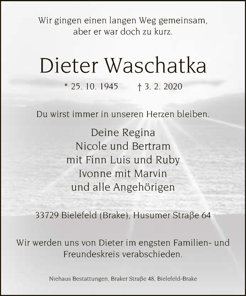 Hier finden Sie alle Traueranzeigen aus der Zeitung, die bisher für Dieter Waschatka erschienen sind. Weitere Traueranzeigen, die in der Zeitung erscheinen, werden hier ebenfalls aufgelistet
