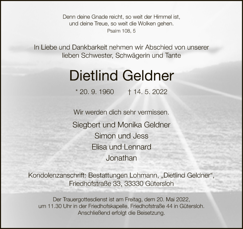 Hier finden Sie alle Traueranzeigen aus der Zeitung, die bisher für Dietlind Geldner erschienen sind. Weitere Traueranzeigen, die in der Zeitung erscheinen, werden hier ebenfalls aufgelistet