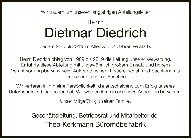 Hier finden Sie alle Traueranzeigen aus der Zeitung, die bisher für Dietmar Diedrich erschienen sind. Weitere Traueranzeigen, die in der Zeitung erscheinen, werden hier ebenfalls aufgelistet