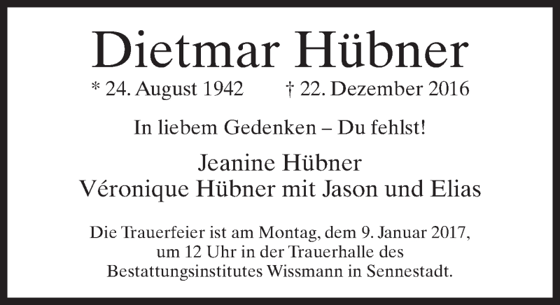 Hier finden Sie alle Traueranzeigen aus der Zeitung, die bisher für Dietmar Hübner erschienen sind. Weitere Traueranzeigen, die in der Zeitung erscheinen, werden hier ebenfalls aufgelistet