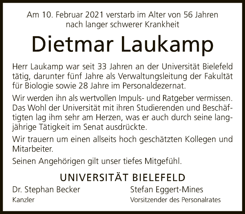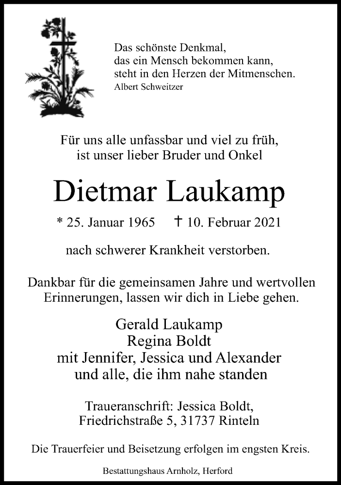 Hier finden Sie alle Traueranzeigen aus der Zeitung, die bisher für Dietmar Laukamp erschienen sind. Weitere Traueranzeigen, die in der Zeitung erscheinen, werden hier ebenfalls aufgelistet