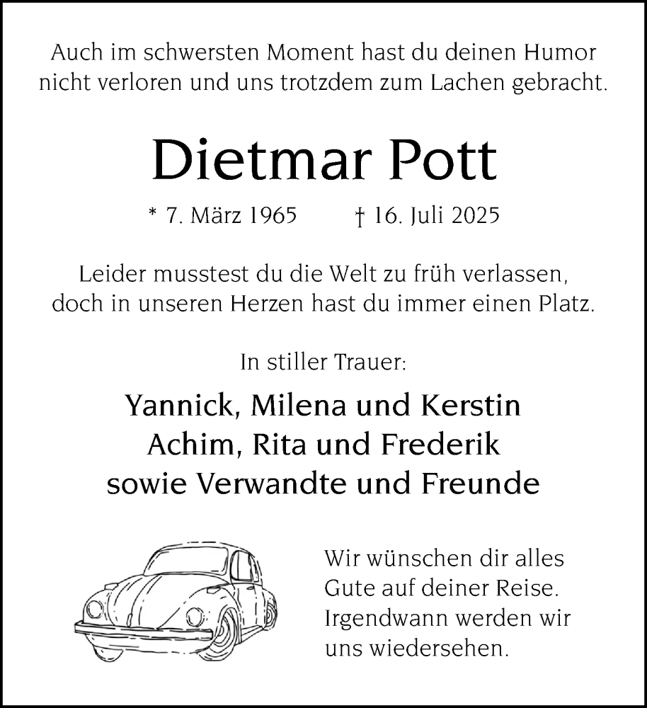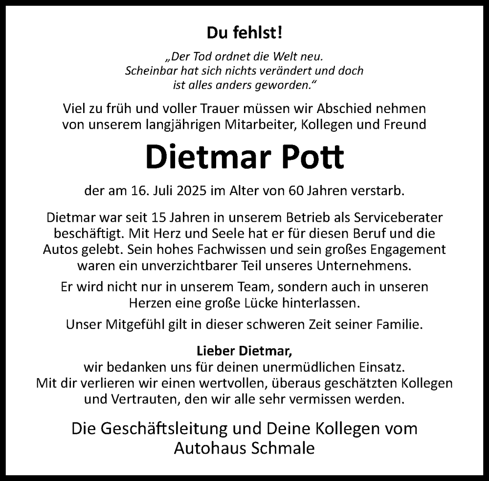 Hier finden Sie alle Traueranzeigen aus der Zeitung, die bisher für Dietmar Pott erschienen sind. Weitere Traueranzeigen, die in der Zeitung erscheinen, werden hier ebenfalls aufgelistet