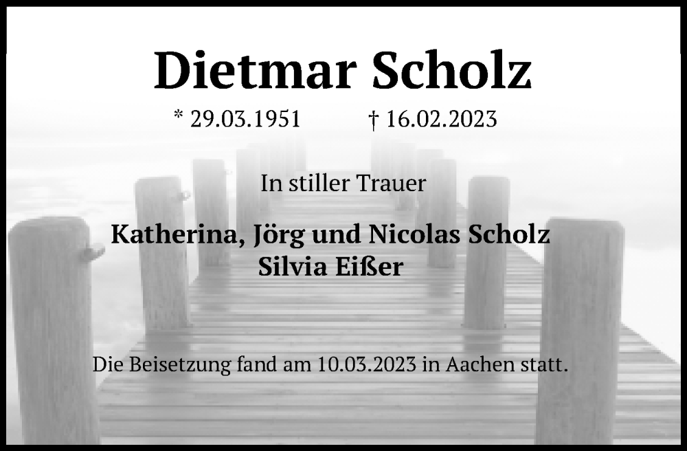 Hier finden Sie alle Traueranzeigen aus der Zeitung, die bisher für Dietmar Scholz erschienen sind. Weitere Traueranzeigen, die in der Zeitung erscheinen, werden hier ebenfalls aufgelistet