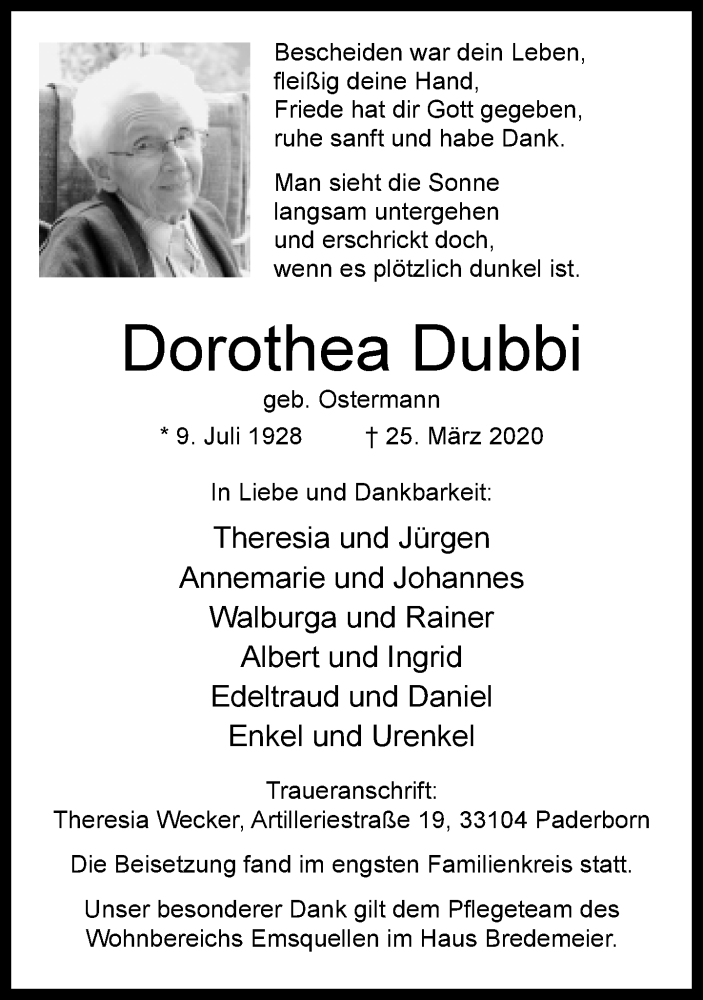 Hier finden Sie alle Traueranzeigen aus der Zeitung, die bisher für Dorothea Dubbi erschienen sind. Weitere Traueranzeigen, die in der Zeitung erscheinen, werden hier ebenfalls aufgelistet