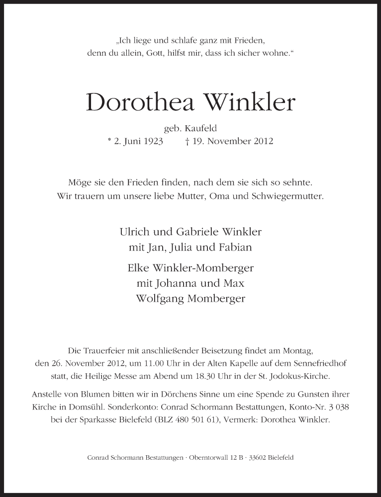 Hier finden Sie alle Traueranzeigen aus der Zeitung, die bisher für Dorothea Winkler erschienen sind. Weitere Traueranzeigen, die in der Zeitung erscheinen, werden hier ebenfalls aufgelistet