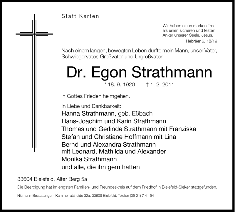 Hier finden Sie alle Traueranzeigen aus der Zeitung, die bisher für Dr. Egon Strathmann erschienen sind. Weitere Traueranzeigen, die in der Zeitung erscheinen, werden hier ebenfalls aufgelistet