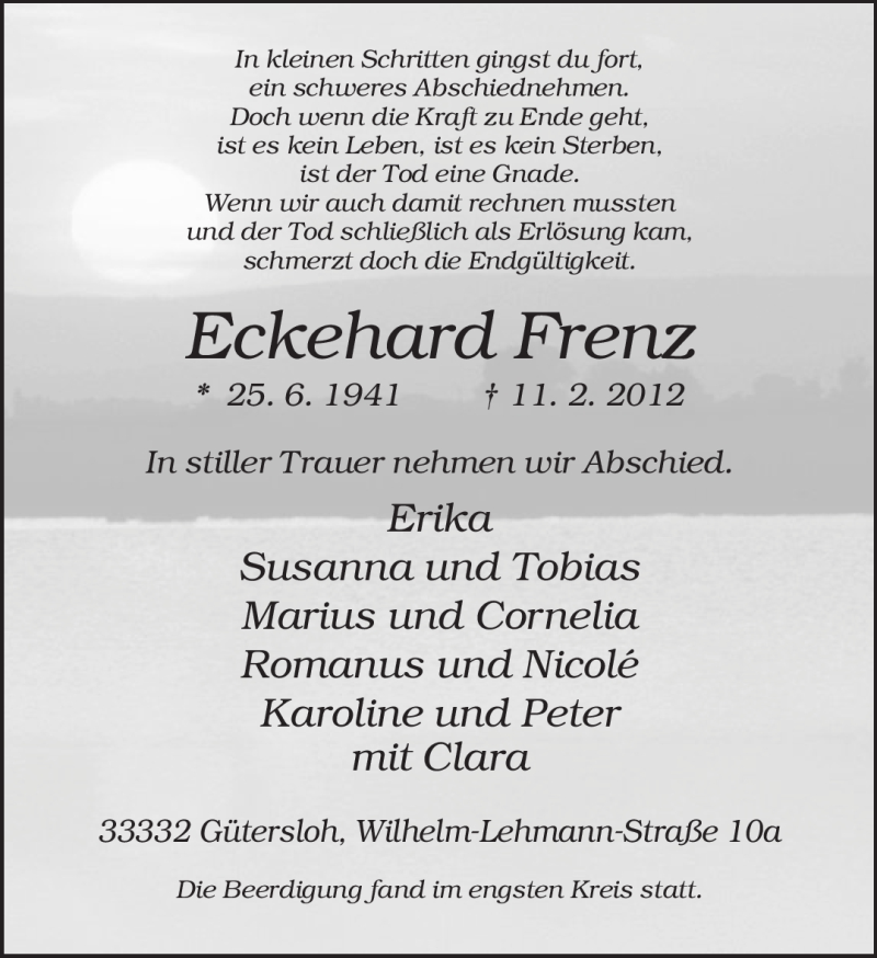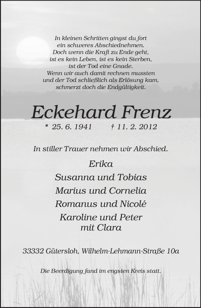 Hier finden Sie alle Traueranzeigen aus der Zeitung, die bisher für Eckehard Frenz erschienen sind. Weitere Traueranzeigen, die in der Zeitung erscheinen, werden hier ebenfalls aufgelistet