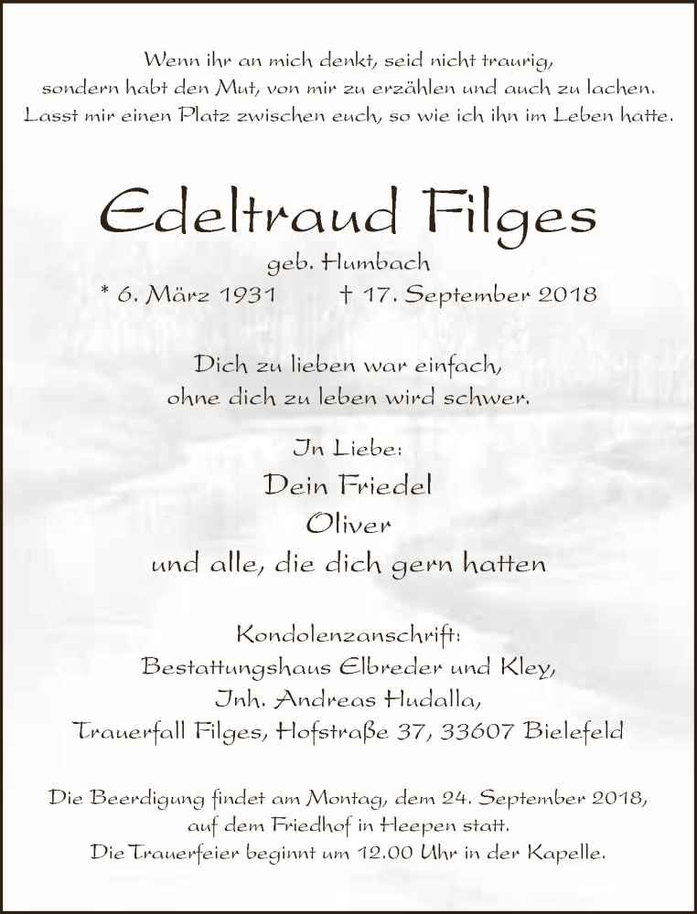 Hier finden Sie alle Traueranzeigen aus der Zeitung, die bisher für Edeltraud Filges erschienen sind. Weitere Traueranzeigen, die in der Zeitung erscheinen, werden hier ebenfalls aufgelistet