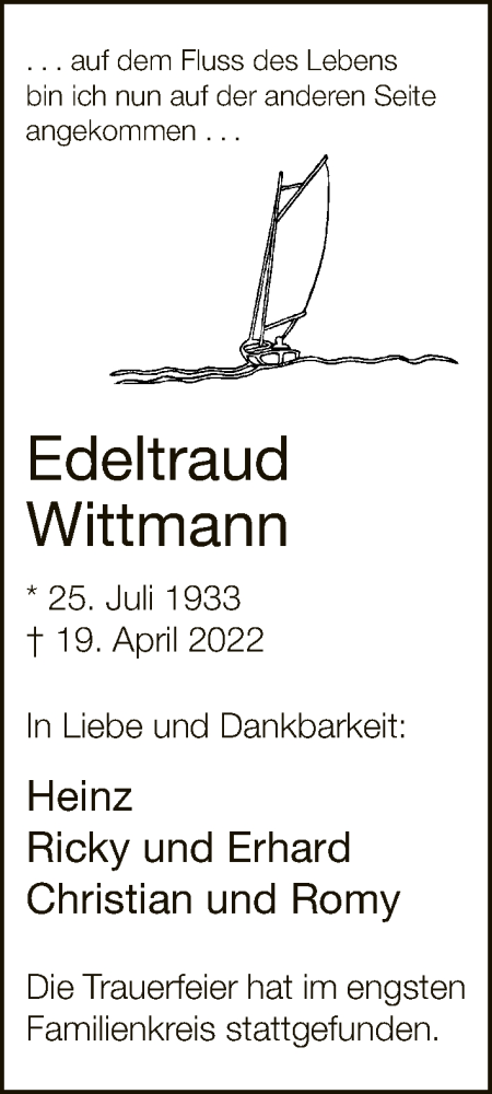 Hier finden Sie alle Traueranzeigen aus der Zeitung, die bisher für Edeltraud Wittmann erschienen sind. Weitere Traueranzeigen, die in der Zeitung erscheinen, werden hier ebenfalls aufgelistet
