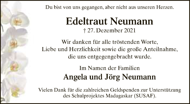 Hier finden Sie alle Traueranzeigen aus der Zeitung, die bisher für Edeltraut Neumann erschienen sind. Weitere Traueranzeigen, die in der Zeitung erscheinen, werden hier ebenfalls aufgelistet