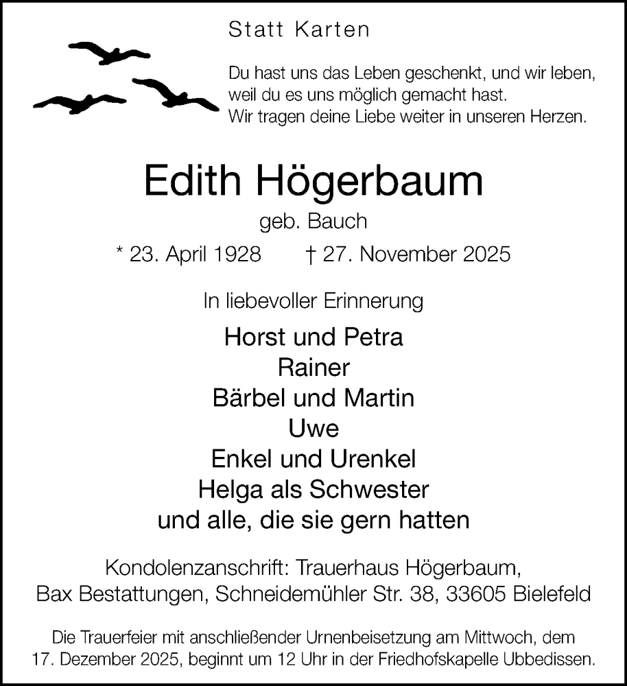 Hier finden Sie alle Traueranzeigen aus der Zeitung, die bisher für Edith Högerbaum erschienen sind. Weitere Traueranzeigen, die in der Zeitung erscheinen, werden hier ebenfalls aufgelistet