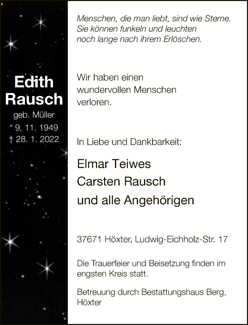Hier finden Sie alle Traueranzeigen aus der Zeitung, die bisher für Edith Rausch erschienen sind. Weitere Traueranzeigen, die in der Zeitung erscheinen, werden hier ebenfalls aufgelistet