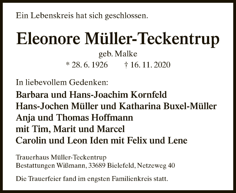 Hier finden Sie alle Traueranzeigen aus der Zeitung, die bisher für Eleonore Müller-Teckentrup erschienen sind. Weitere Traueranzeigen, die in der Zeitung erscheinen, werden hier ebenfalls aufgelistet
