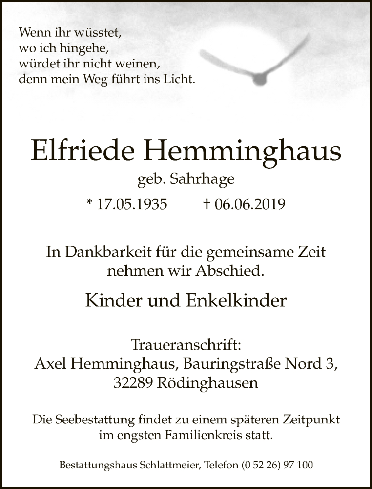 Hier finden Sie alle Traueranzeigen aus der Zeitung, die bisher für Elfriede Hemminghaus erschienen sind. Weitere Traueranzeigen, die in der Zeitung erscheinen, werden hier ebenfalls aufgelistet