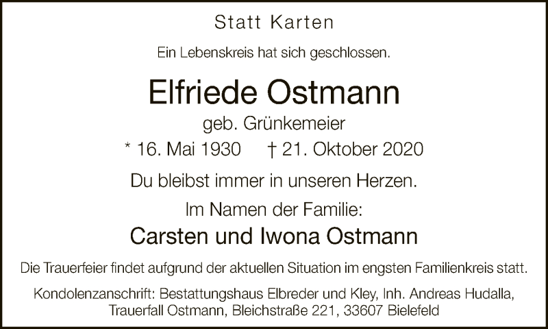 Hier finden Sie alle Traueranzeigen aus der Zeitung, die bisher für Elfriede Ostmann erschienen sind. Weitere Traueranzeigen, die in der Zeitung erscheinen, werden hier ebenfalls aufgelistet