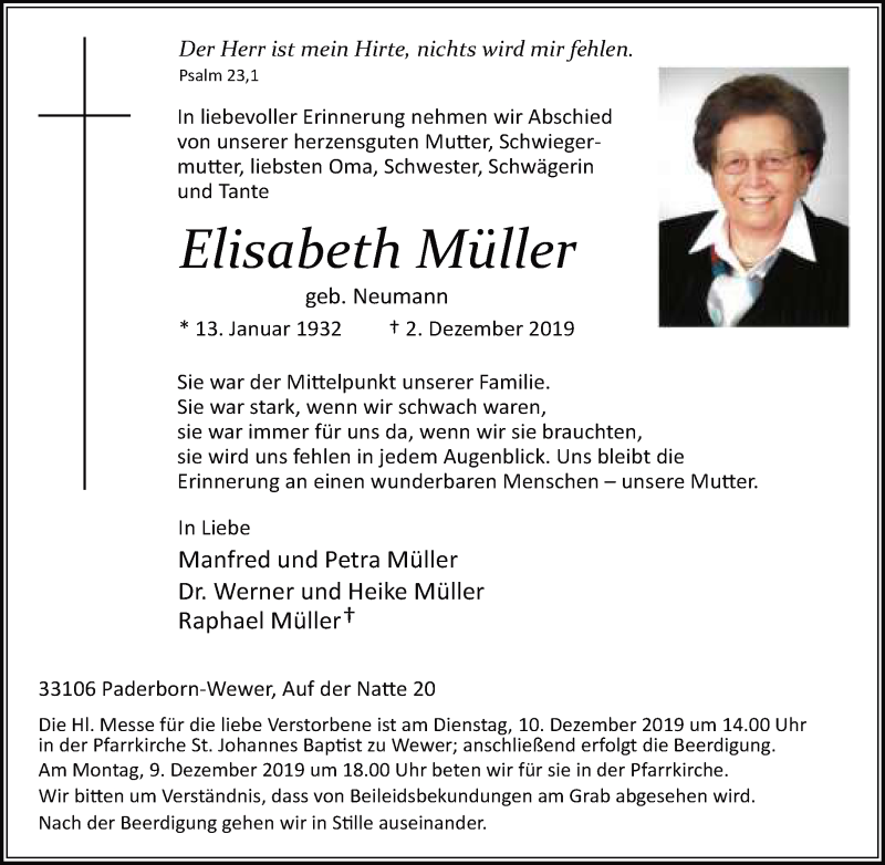 Hier finden Sie alle Traueranzeigen aus der Zeitung, die bisher für Elisabeth Müller erschienen sind. Weitere Traueranzeigen, die in der Zeitung erscheinen, werden hier ebenfalls aufgelistet