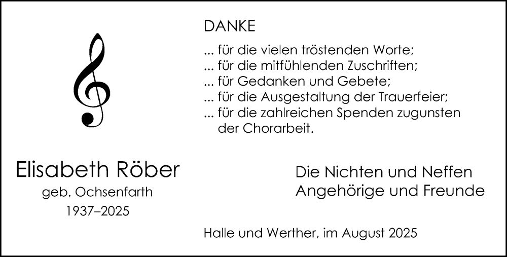 Hier finden Sie alle Traueranzeigen aus der Zeitung, die bisher für Elisabeth Röber erschienen sind. Weitere Traueranzeigen, die in der Zeitung erscheinen, werden hier ebenfalls aufgelistet