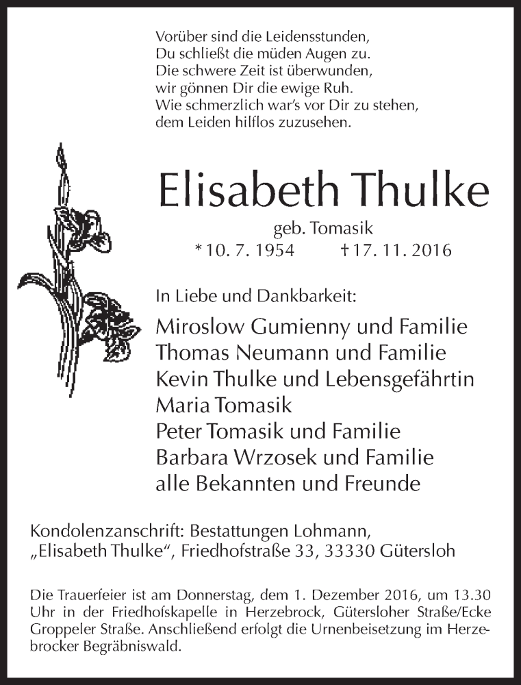 Hier finden Sie alle Traueranzeigen aus der Zeitung, die bisher für Elisabeth Thulke erschienen sind. Weitere Traueranzeigen, die in der Zeitung erscheinen, werden hier ebenfalls aufgelistet