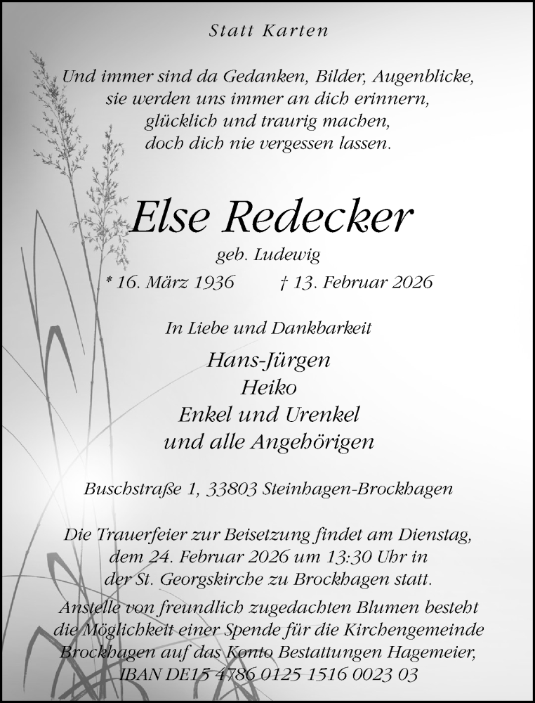Hier finden Sie alle Traueranzeigen aus der Zeitung, die bisher für Else Redecker erschienen sind. Weitere Traueranzeigen, die in der Zeitung erscheinen, werden hier ebenfalls aufgelistet