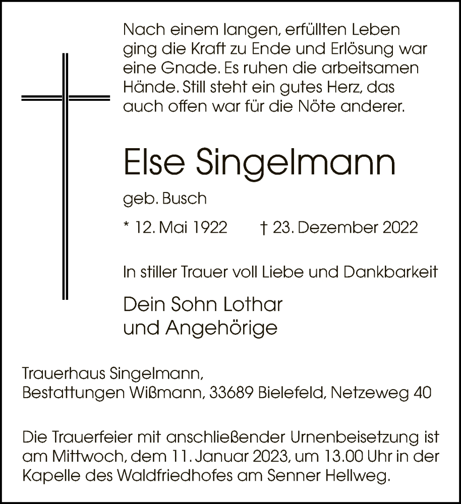 Hier finden Sie alle Traueranzeigen aus der Zeitung, die bisher für Else Singelmann erschienen sind. Weitere Traueranzeigen, die in der Zeitung erscheinen, werden hier ebenfalls aufgelistet