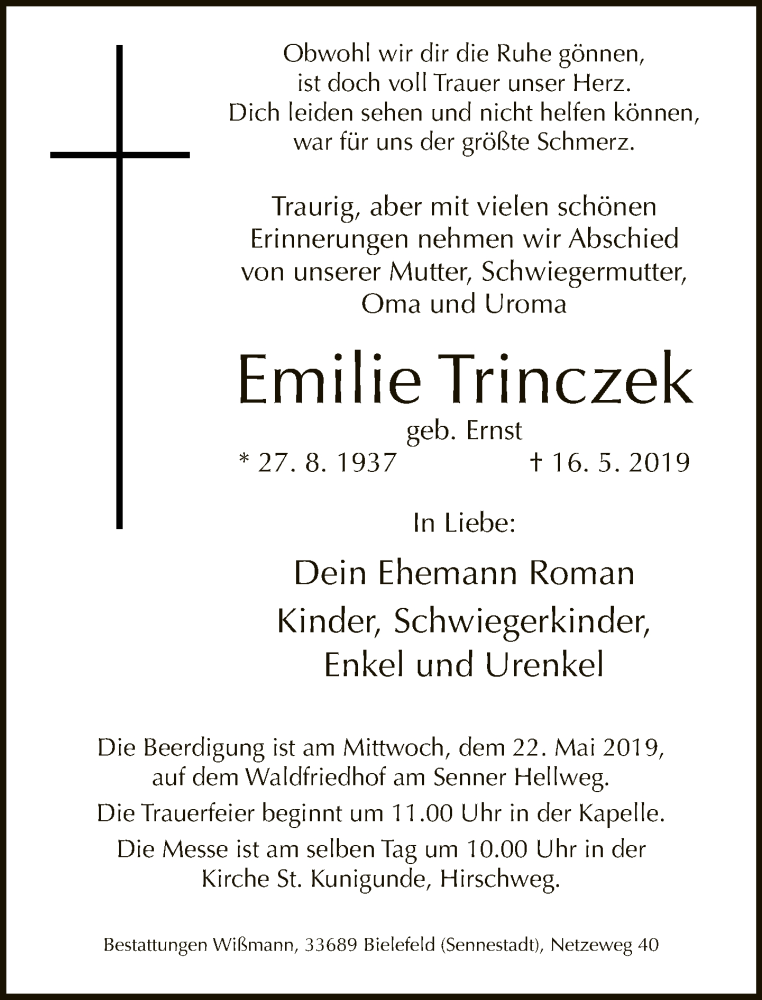 Hier finden Sie alle Traueranzeigen aus der Zeitung, die bisher für Emilie Trinczek erschienen sind. Weitere Traueranzeigen, die in der Zeitung erscheinen, werden hier ebenfalls aufgelistet