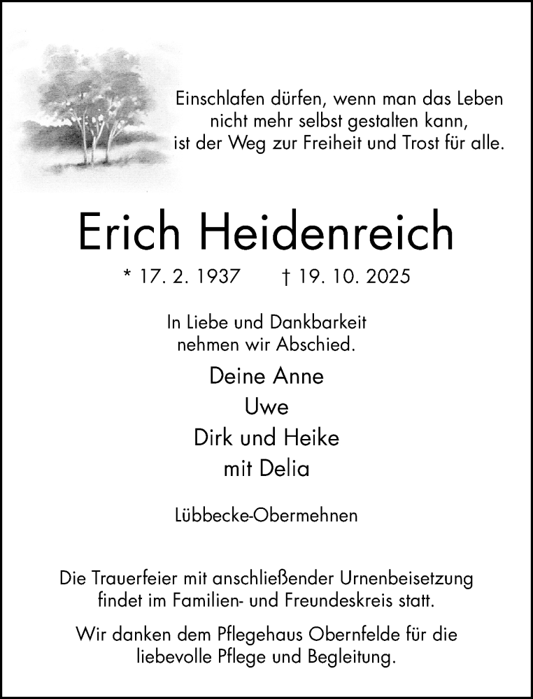 Hier finden Sie alle Traueranzeigen aus der Zeitung, die bisher für Erich Heidenreich erschienen sind. Weitere Traueranzeigen, die in der Zeitung erscheinen, werden hier ebenfalls aufgelistet