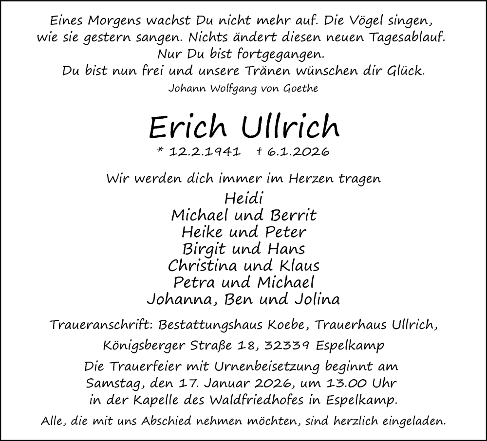 Hier finden Sie alle Traueranzeigen aus der Zeitung, die bisher für Erich Ullrich erschienen sind. Weitere Traueranzeigen, die in der Zeitung erscheinen, werden hier ebenfalls aufgelistet