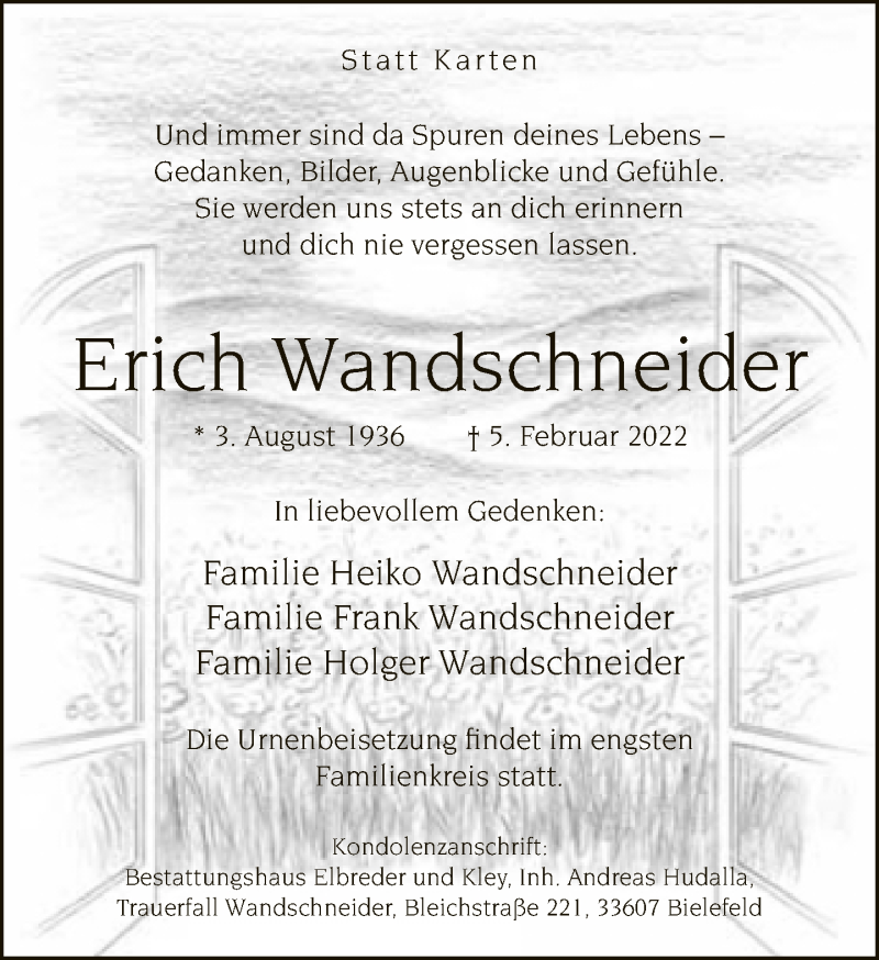 Hier finden Sie alle Traueranzeigen aus der Zeitung, die bisher für Erich Wandschneider erschienen sind. Weitere Traueranzeigen, die in der Zeitung erscheinen, werden hier ebenfalls aufgelistet