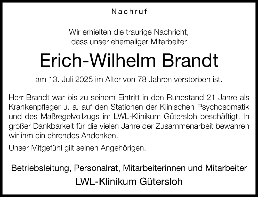 Hier finden Sie alle Traueranzeigen aus der Zeitung, die bisher für Erich-Wilhelm Brandt erschienen sind. Weitere Traueranzeigen, die in der Zeitung erscheinen, werden hier ebenfalls aufgelistet