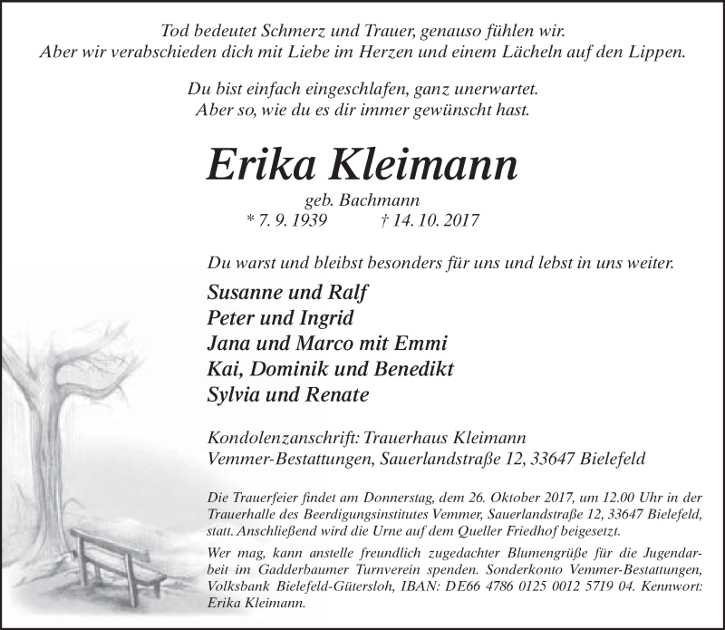 Hier finden Sie alle Traueranzeigen aus der Zeitung, die bisher für Erika Kleimann erschienen sind. Weitere Traueranzeigen, die in der Zeitung erscheinen, werden hier ebenfalls aufgelistet