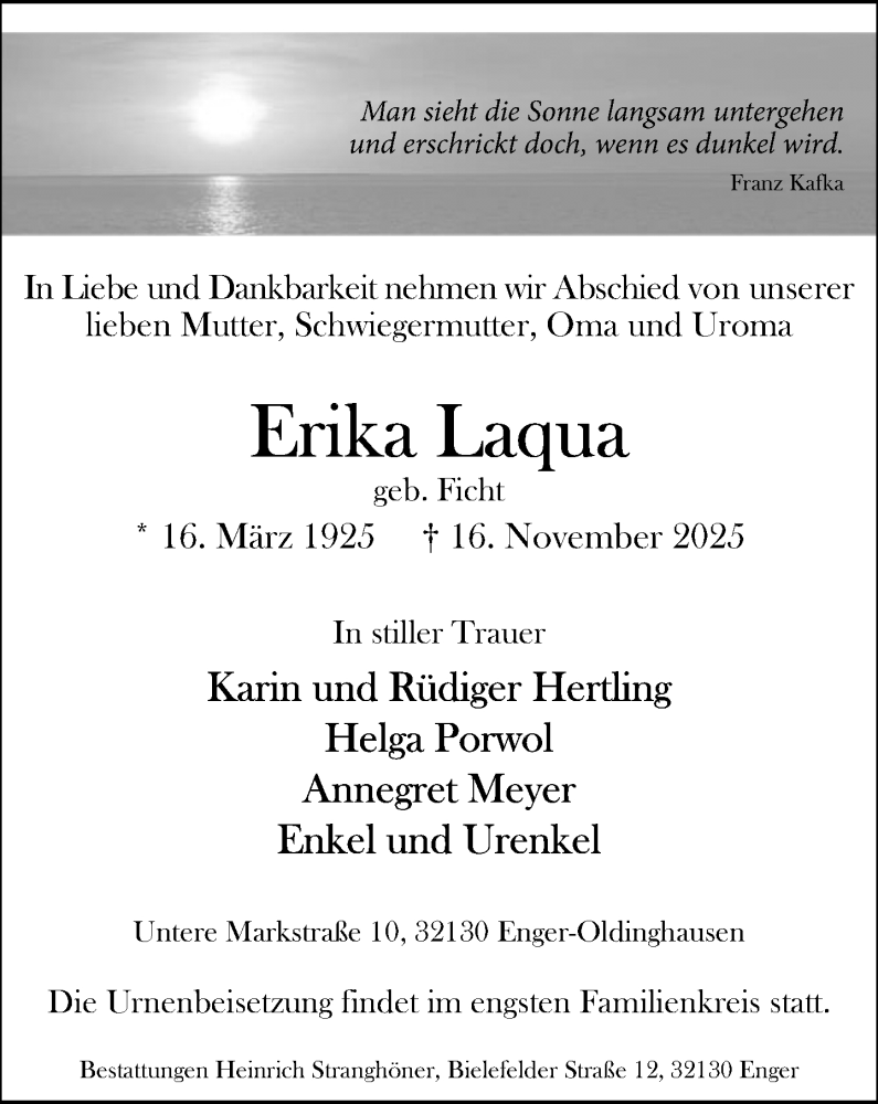 Hier finden Sie alle Traueranzeigen aus der Zeitung, die bisher für Erika Laqua erschienen sind. Weitere Traueranzeigen, die in der Zeitung erscheinen, werden hier ebenfalls aufgelistet