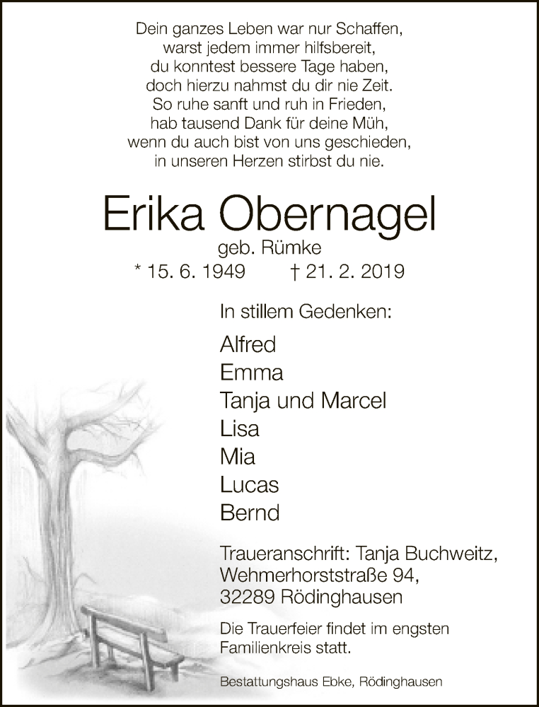 Hier finden Sie alle Traueranzeigen aus der Zeitung, die bisher für Erika Obernagel erschienen sind. Weitere Traueranzeigen, die in der Zeitung erscheinen, werden hier ebenfalls aufgelistet