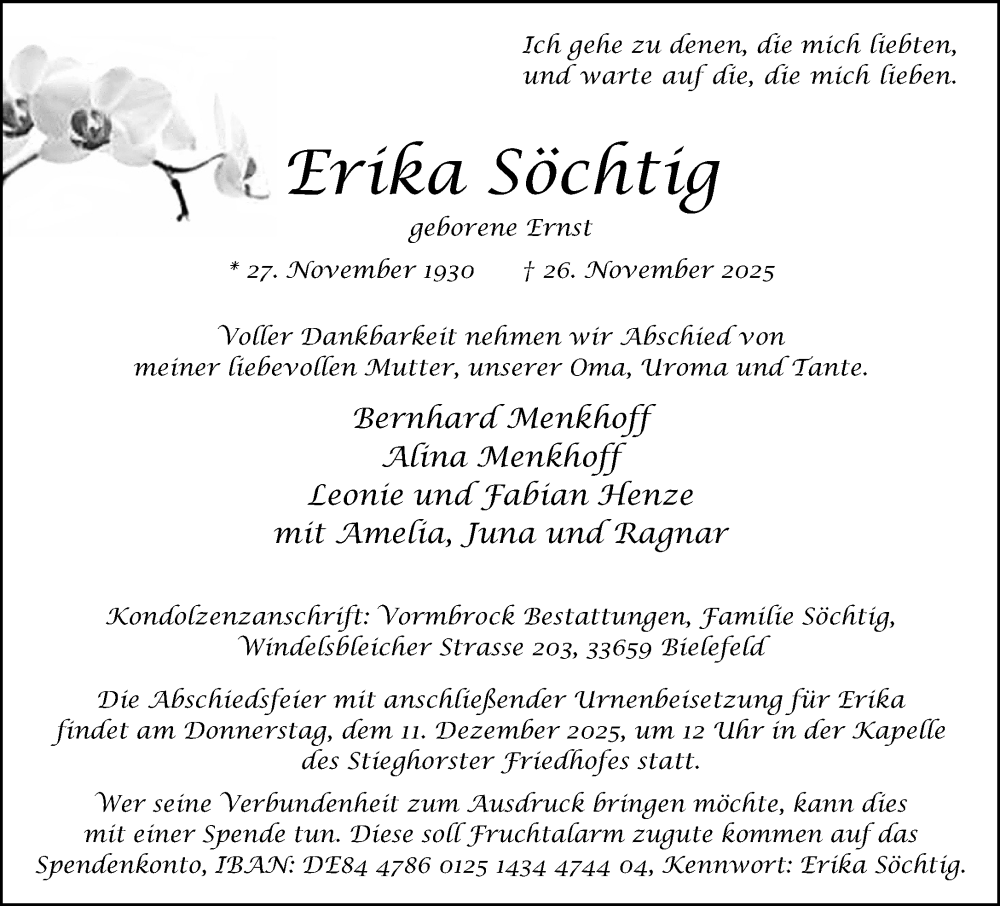 Hier finden Sie alle Traueranzeigen aus der Zeitung, die bisher für Erika Söchtig erschienen sind. Weitere Traueranzeigen, die in der Zeitung erscheinen, werden hier ebenfalls aufgelistet