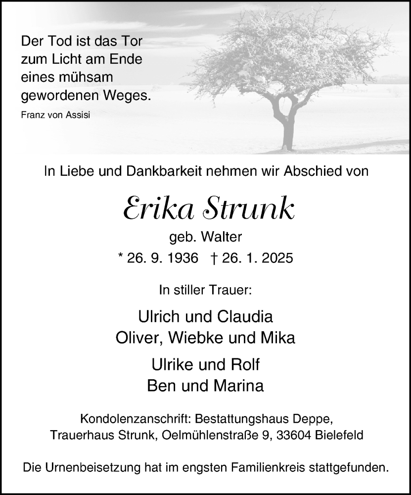 Hier finden Sie alle Traueranzeigen aus der Zeitung, die bisher für Erika Strunk erschienen sind. Weitere Traueranzeigen, die in der Zeitung erscheinen, werden hier ebenfalls aufgelistet