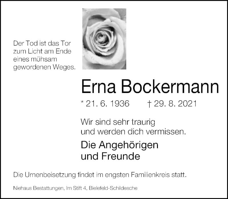 Hier finden Sie alle Traueranzeigen aus der Zeitung, die bisher für Erna Bockermann erschienen sind. Weitere Traueranzeigen, die in der Zeitung erscheinen, werden hier ebenfalls aufgelistet