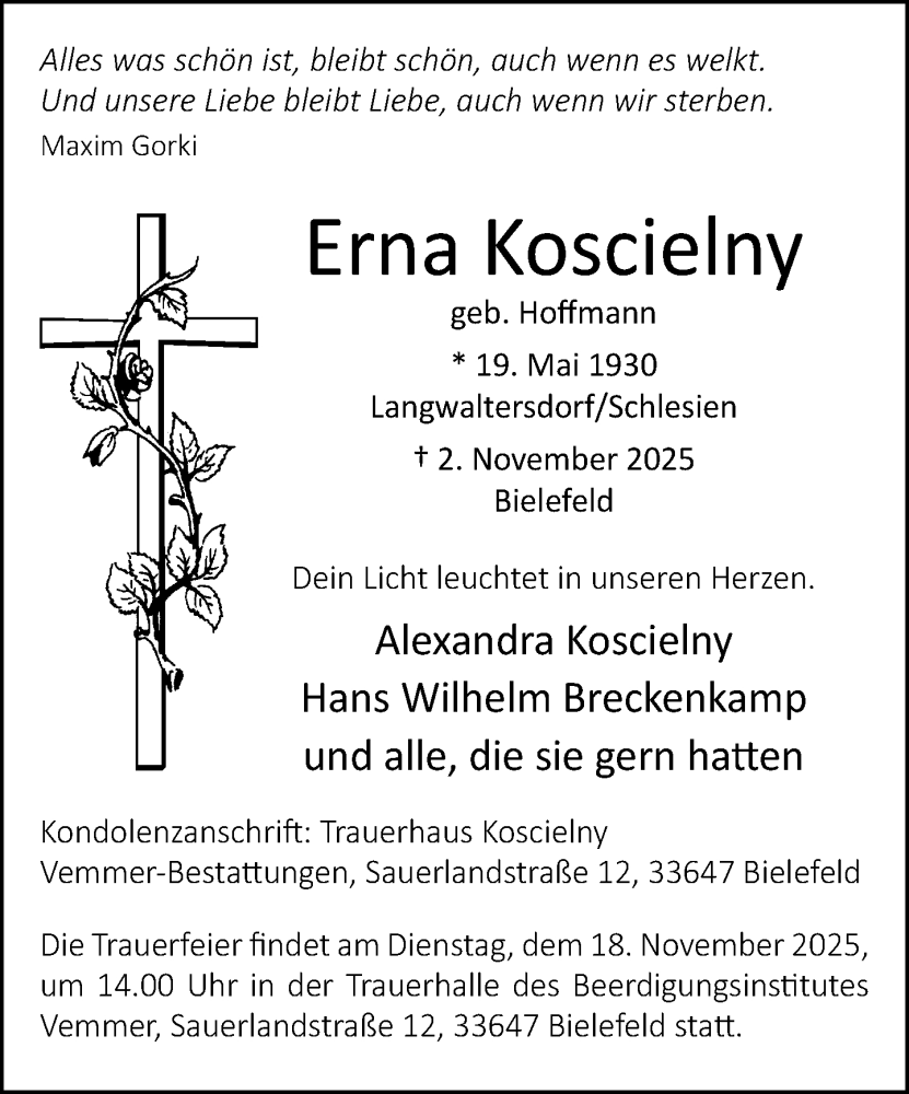 Hier finden Sie alle Traueranzeigen aus der Zeitung, die bisher für Erna Koscielny erschienen sind. Weitere Traueranzeigen, die in der Zeitung erscheinen, werden hier ebenfalls aufgelistet